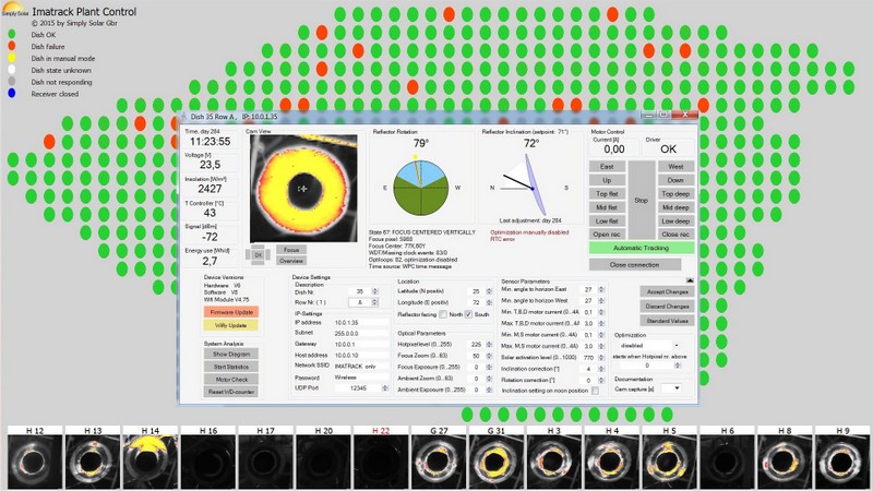 Constant plant monitoring, control and software updates are made easy over the Wifi network and the "Imatrack Plant Control (IPC)" Software. Faults, as high or low motor currents or component failures are reported immediately to the operational staff for fast troubleshooting and repair. With help of the DRC Android App the staff can control and adjust single dishes in the field.